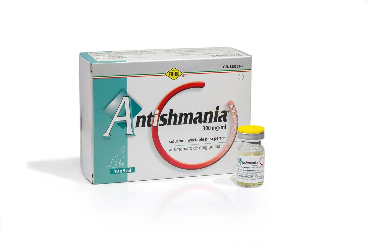 Antishmania / Антишмания – лекарственное средство для инъекций животным больным лейшманиозом, реализуется в виде раствора бледно-жёлтого цвета в ампулах по 5 мл, всего в коробке 10 ампул. Главным действующим веществом является антимониат меглумина, в качестве вспомогательных веществ в препарат добавлены: метабисульфат калия, сульфит натрия. Невскрытые ёмкости можно хранить в течение срока годности при температурном режиме не выше 25 градусов, после вскрытия ампулы лекарство следует использовать сразу же. Терапия показывает эффективность в течение 4 недель, поскольку в большинстве случаев лейшманиоз у собак излечим, если заболевание не поддаётся лечению, ветеринар делает выводы об устойчивости штамма Лейшмании и заменяет препарат на другой.